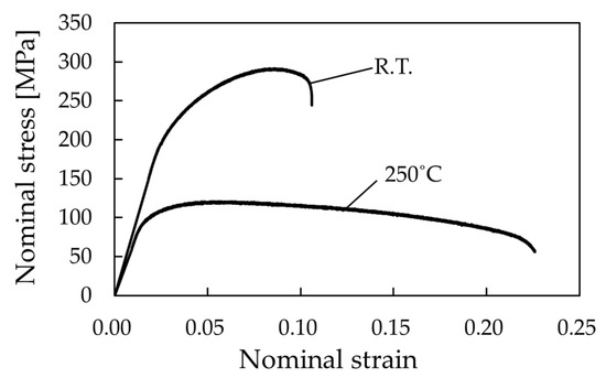 Then, the material characteristic of the small-diameter ZM21 tube, which was used for THF, was evaluated by the tensile test at RT and 250 °C. The tube material manufactured by hot drawing [16] has a similar chemical composition to the ZM21 rod, as shown in Table 1. The tube has a 2.0 mm outer diameter and 0.2 mm wall thickness. The tubular test specimen was chucked between the upper and lower chucks, with a distance between each chuck of approximately 10 mm, which is the same as the gauge length. The tensile speed was set to 0.6 mm/min. Figure 5 shows the nominal stress–nominal strain diagram of the ZM21 tube. The ductility of the ZM21 tube at 250 °C is 210% higher than the test result at RT. Comparing the tensile test results, shown in Figure 4, with the test results for ZM21 rods, shown in Figure 5, correlations are observed between the tube and the rod materials in relation to changes of the deformation resistance and the ductility.