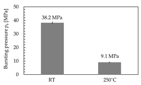 Moreover, the bursting pressure pb of the ZM21 tube was measured by the bursting test at RT and 250 °C, in order to define the fracture limit of the tube in THF. The internal pressure was loaded linearly by 1.0 MPa/s, until the tube burst. Figure 6 shows the result of the test. The bursting limit at 250 °C is 23% of the limit at RT.