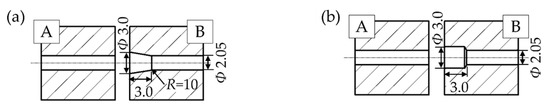 Figure 9 shows the die used for the warm THF experiment. The deformation characteristics of the tubes, which are deformed in the taper-cavity die (Figure 9a) and the cylinder-cavity die (Figure 9b), were evaluated. The divided asymmetrical dies with A-side and B-side parts, as shown in the figures, were employed. Each side has a different cavity: the A-side has a straight cavity, without bulging, and the B-side has a taper- or a cylinder-cavity. The taper- and the cylinder-cavity have an expansion ratio that is 1.5 times the maximum, in comparison with the initial outer diameter of the ZM21 tube. Before processing, every tube was annealed at 300 °C for 24 h.