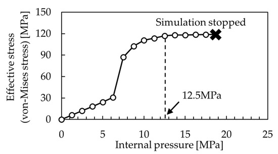 To define the internal pressure conditions in the simulation, the bursting pressure was calculated by the bursting test in FEM. In this test, the internal pressure ph was loaded linearly, without loading of the axial feeding. Figure 11 shows the maximum equivalent von-Mises stress of the tube obtained from the test. The tube reached around the maximum value of the stress at ph = 12.5 MPa. After that, the simulation stopped due to the occurrence of a negative volume of the elements in the tube. Therefore, it is considered that the bursting pressure pb of the tube in FEM is 12.5 MPa.