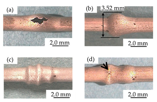 Deformation characteristics of the small ZM21 tube deformed under the various internal pressure conditions: (a) a fracture (α = 90%); (b) bulge without fractures or wrinkles (α = 80%); (c) a wrinkle (α = 70%); (d) a wrinkle and folding (α = 50%).