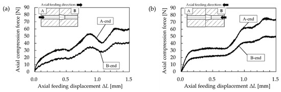 Effect of the axial feeding direction on the axial compressive force during the process: (a) no wrinkle; (b) wrinkle.
