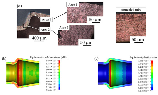 In addition, Figure 16a shows the microstructure in the taper-shaped tube obtained in the CASE A condition. Grain with twin boundaries and grain that is finer than the grain in the annealed tube were confirmed in the taper-shaped tube. Figure 16b shows the equivalent von-Mises stress, and Figure 16c shows the equivalent plastic strain in the deformed area of the tube. These plots show that higher compressive stresses and strain appeared conspicuously on the inside of the bended part of the hydroformed tube. There is a correlation between the area where the grain with twin boundaries and the refined grain were observed and that where the higher compressive stresses and strain appeared. It is considered that the deformed tube has advantages, such as a high strength and high-stress corrosion resistance, because of the refinement of the grain. However, their occurrence behavior during the process is yet to be observed and noted in detail. More specific observations of the changes of the microstructure in the tube during the deformation is necessary in evaluating the refinement behavior of the grain in the hydroformed tube.