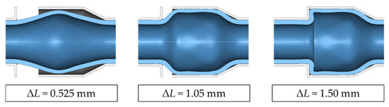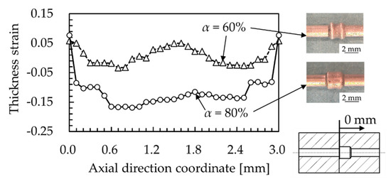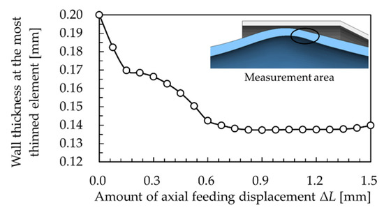 When the cylinder-cavity die was employed, warm THF was impossible under both axial feeding conditions, because the tube was fractured during the processing. Figure 17 shows the deformation behavior of the tube, which was deformed in the cylinder-cavity die obtained by FEM. In addition, Figure 18 shows the thinning behavior of the wall of the tube, in the area where the maximum reduction of the wall thickness was observed in FEM. As shown in Figure 17, the tube appeared to have been deformed successfully at first glance. However, it is clear that a severe decrease of the thickness occurred at ΔL = 0.525 mm. The maximum thickness strain in that area was −31.5% at ΔL = 0.9 mm, and the wall thickness of the tube was decreased from 0.2 mm to 0.137 mm. It is considered that the tube fractured during the axial feeding, due to the severe thinning deformation of the wall in the experiment. Therefore, the suppression of the thinning of the wall is necessary to avoid fracture when the cylinder-cavity die is employed for warm THF.