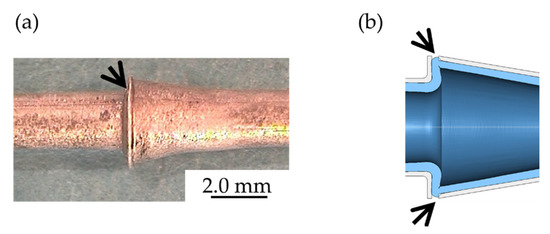 Moreover, the forming limit for the die corner shape in the right-angle die corner was evaluated. Figure 28 shows the axial cross-sections of the taper-shaped tube (Figure 28a) and the cylinder-shaped tube (Figure 28b) under the conditions of ΔL = 1.5 mm and α = 80% in Stage (3). In each processing stage, filling to the die corner was insufficient. The obtained radii of the corner-shape R were 0.318 mm in Figure 28a and 0.384 mm in Figure 28b. From this result, it is considered that the forming limit of the tube in the die corner is approximately R = 0.3 to 0.4 mm. For the filling of the tube material to the sharper die corner, it seems that the material flow into the die is necessary. In this study, the axial feeding was carried out, without an axial compressive paunch. Thus, the tube material could barely flow into the die cavity. Additionally, there is a disagreement in the bending shape of the hydroformed tubes between the taper- and the cylinder-shaped tube. It is considered that this disagreement is caused by the difference in the ratio of the axial feeding displacement to the die-cavity volume between these dies. The cylinder-cavity die has a lager die cavity volume than the volume of the taper-cavity die. Therefore, optimization of the amount of the axial feeding displacement that is applied to the tube in relation to the die cavity volume is required.
