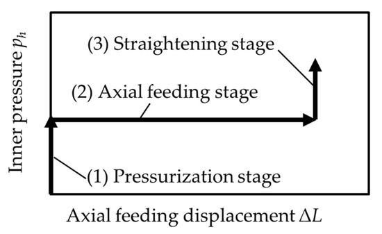 Warm THF was conducted on the small-diameter ZM21 tube with a 2.0 mm outer diameter and 0.2 mm wall thickness under an elevated temperature condition (250 °C). Silicone oil was used as the hydraulic pressure medium, and molybdenum disulfide (MoS2) paste was employed to provide lubrication between the tube and the die. Figure 8 shows the loading path of the internal pressure ph and the axial feeding displacement ΔL adopted in the experiment. In the loading path, Stage (1) is the hydraulic pressure stage. The internal oil pressure is loaded on the predetermined internal pressure ph. The pressure is maintained after the pressure medium is filled, and the air in the tube is vented. The value of ph was defined based on α. It is defined by a percentage of the loaded internal pressure ph to the bursting pressure pb. After that, in Stage (2), axial feeding is carried out to deform the tube, which produces the axial feeding displacement ΔL = a maximum of 1.5 mm, while maintaining the internal pressure ph. In Stage (2), the axial feeding is applied at a speed of 0.025 mm/s.