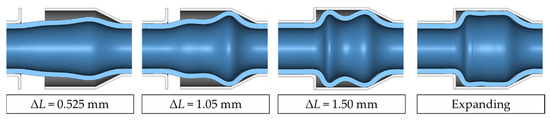 On the other hand, the wall thickness of the hydroformed tubes was not uniform. Figure 24 shows the expansion distribution of the hydroformed tubes. Remarkably, the expansion of the tube occurs in the valley of the wrinkle. Compared with the deformed tube shape, the position of the notably thickened area was the shoulder and the valley part between the left wrinkle and right wrinkle in Stage (2), as shown in Figure 23. After the straightening (Stage (3)), the thinning remarkably proceeded in the valley. This thinning is caused by a local expansion in the valley of the wrinkles. The deformation of the tube is constrained due to the top of the wrinkles touching the die cavity at the end of Stage (2). Therefore, the tube is expanded in the valley of the wrinkles only in Stage (3), and this area shows severe thinning deformation of the wall.