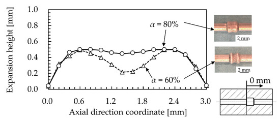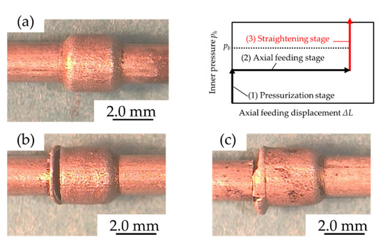 Figure 20 shows the modified loading path. To avoid forming defects, as mentioned in Section 3.3, the internal pressure ph at Path (2) was maintained with a lower value, which can suppress the occurrence of forming defects. In this experiment, the internal pressure was loaded, and it was α = 60% in Stage (1) and (2). In Stage (2), the axial feeding was applied while maintaining the internal pressure. The occurrence of wrinkling is allowed in this stage. After that, the straightening stage was installed, as Stage (3) in the loading path, to expand the wrinkled tube. The internal pressure was raised from α = 60% to 80% in the straightening stage. The experiments were carried out at 250 °C, and the axial feeding condition used was CASE A, with ΔL = 1.5 mm. The hydroformed samples were observed in Stage (2) and (3).