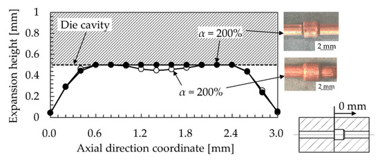 To determine the value of the internal pressure that is loaded during the axial feeding in Stage (2) shown in Figure 8, the fracture and the buckling limits of the small-diameter ZM21 tube were evaluated by warm free bulge forming at 250 °C. The die used for this evaluation is shown in Figure 12. The employed internal pressure conditions α were 90%, 80%, 70% and 50%, and the axial feeding was performed at ΔL = 1.5 mm. Figure 13 shows the hydroformed tubes obtained under each condition. When the loaded pressure was high (Figure 13a), the tube fractured immediately after the axial feeding was applied (ΔL = 0.27 mm), and the tube could not be expanded. On the other hand, when the loaded pressure was low (Figure 13c), wrinkles appeared on the tube. Additionally, the tube was fractured by severe folding deformation when the maintained internal pressure α was 50%, as shown in Figure 13d. Therefore, it is considered that the buckling limit of the tube α = 50%, and the fracture limit α = 90%. However, the tube successfully expanded when α was 80%. Figure 13b shows the successfully hydroformed tube, without wrinkles, folds or fractures. The outer diameter of the hydroformed tube was 3.23 mm, in this case.