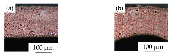 In addition, the expansion distribution of the hydroformed tube with the loaded pressure condition α = 200% in Stage (3) is shown in Figure 26. The results of the warm THF, without the straightening (α = 60%) and with the straightening (α = 80%), are shown in that figure for comparison. The tube expanded sufficiently from the wrinkled to the cylinder-shape when α = 200%. Conversely, the expansion of the tube, which was straightened with raised pressure α = 80%, was incomplete, compared with the hydroformed tube with α = 200%. The cause of the insufficient expansion when α was 80% in the straightening stage is considered to be the high strength of the tube material, owing to grain refinement, as mentioned in Section 3.2. Figure 27 shows the microstructure of the tube that was wrinkled in Stage (2). At the top of the wrinkle, there were approximately 20 fine-grained layers in the wall thickness direction, as shown in Figure 27b, and the average grain size was approximately 9.3 µm (Figure 27a). On the other hand, the grain size in the non-deformed area was 21.5 μm. Therefore, warm THF of the tube, from the wrinkle to the die cavity shape, requires the loading of a higher internal pressure to straighten the wrinkle.