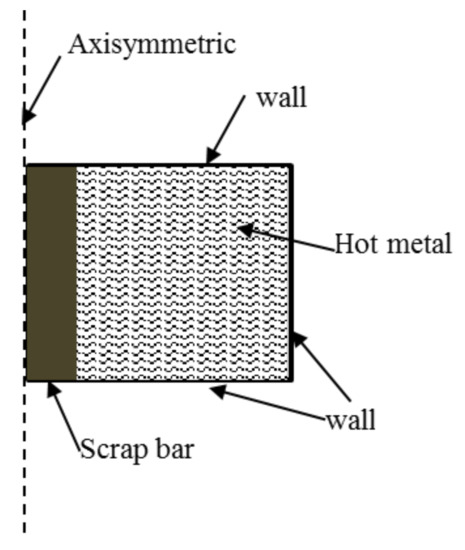 Accordingly, a mathematical model was built based on the experimental condition to investigate more parameters which may affect the melting of the scrap bar. A 2-D axisymmetric model was employed to describe the melting process of the scrap bar in the hot metal. To simplify the calculation, a wall function was applied above the molten hot metal instead of the shield gas phase of the experiment in the mathematical model, as shown in Figure 2. The temperature of the top wall was set to be 10 °C lower than that of the bath temperature according experimental measurements. The temperature of the side wall and the bottom wall of the crucible were the same with the temperature of the furnace ambient. The mathematical model performed the phenomena from the time that the bar was immerged in the bath to the time that the bar melting was finished, so the initial bar temperature was set to be the same with the room temperature (25 °C). The initial carbon content of the bar and the hot metal was 0.1 and 4.0 wt.%, respectively. More physical properties of the steel used in the mathematical model are shown in Table 3. Three bath temperatures of 1350, 1400, and 1450 °C were considered to study the temperature effects on the melting behaviors. The other investigating parameters for the scrap bar used in the mathematical model are the same with that of the experiments, as shown in Table 4.