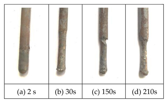 Appearance of the steel bar after immersion in the hot metal: (a) 2 s, (b) 30 s, (c) 150 s, (d): 210 s.