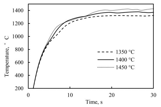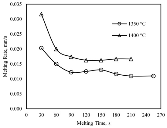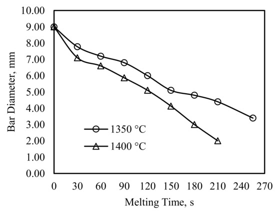 The results demonstrate that, firstly, the scrap bar may melt under conditions where the temperature of the hot metal is lower than that of the melting point of the scrap bar, as shown in Figure 3. The diameter of the scrap bar is decreased when the melting time is increased. The diameter changes of the scrap bar are shown in Figure 4, the values shown in the figure is an average diameter of the melting bar at three different vertical levels. Apparently, the diameter of the bar with bath temperature of 1400 °C is smaller than that of the bath temperature of 1350 °C at the same immersion time, which means that increasing melting temperature can increase the melting rate of the bar.