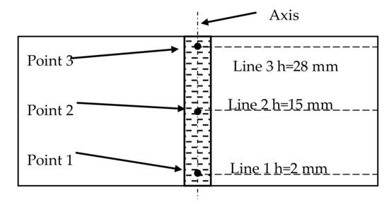 To fully understand the variations of the considered parameters in the bath, three monitor points and monitor lines were applied in the calculation domain to analyze the parameter changes of the bar and the bath temperatures, the bar diameters, the carbon distributions, and the bath flow, the monitor positions are shown in Figure 6.