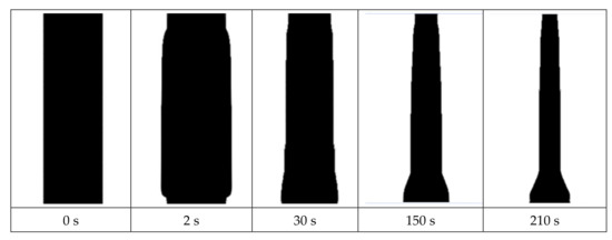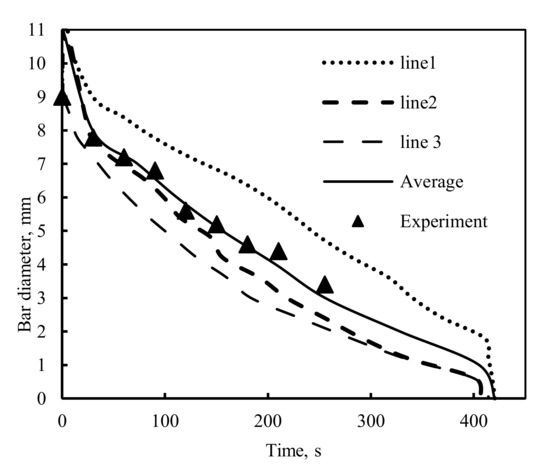 The average values of the diameter at three monitor lines was calculated and shown in Figure 8. Compared to the experimental results shown in Figure 4, it shows the variation are in a range of 2–12% for the discrete melting times in the experiment. The causes of the differences between the experimental and mathematical results could be the temperature distribution of the crucible, minor movement or position of the bar, the effects of minor elements in the hot metal and the scrap bar, or other manual operations. In addition, the mathematical model would also arise some errors that would cause the deviations of the results.