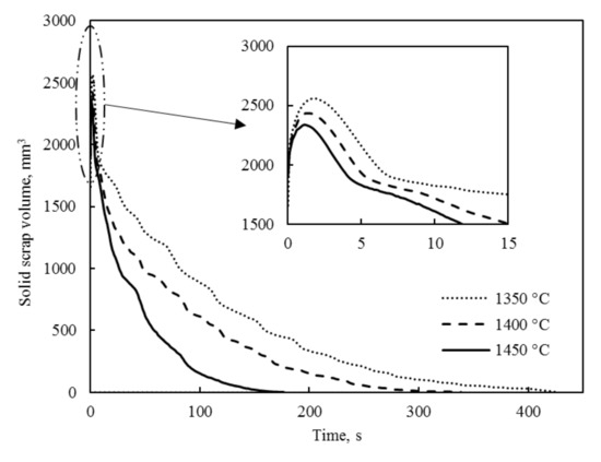 The volume changes of the bar were also analyzed to further study the behavior of the bar during the melting process, the results are shown in Figure 9. As shown in figure, originally, the volume of the scrap bar is approximately 1660 mm3. Because the initial temperature of the scrap is room temperature, a solid shell is formed when the bar is immerged in the hot metal. As a result, the solid volume is increased and then decreased when the temperature of the solid shell reaches its melting point under the condition of heat transfer. The maximum values of the solid phase are 2562, 2432, and 2338 mm3 when the initial temperature of the hot metal are 1350, 1400, and 1450 °C, increasing about 54%, 46%, and 40%, respectively. This suggests that more solid shell would be formed around the scrap when the bath temperature is relatively low. Consequently, it is recommended that the volume of the scrap added into the hot metal ladle or the torpedo car should be designed carefully to avoid the melting and flow problem since the temperature of the hot metal is normally low compared the condition in a BOF.
