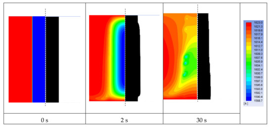 The diameter change of the bar has a significant relationship with the temperature distribution of the bath and the bar. As a result, the temperature distribution and variation during the melting process are analyzed to investigate the relationship between temperature and melting profile of the bar. Figure 10 shows the bar diameter changes the temperature distribution at corresponding melting times when the melting temperature is 1350 °C. It demonstrates that the solid shell formed on the surface of the bar is caused by the low temperature of the bar when the bar is immerged into the bath at the first several seconds. And the temperature at the upper and down part of the bar is normally higher than that of the middle part.