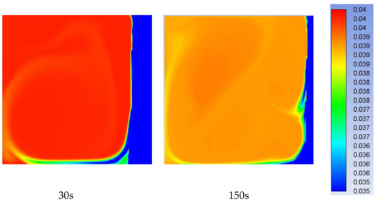 Figure 10 also shows that the temperature at 30 s is not a regular distribution. This is largely influenced by the temperature difference in the bath and the bath flow, which is shown in Figure 13. It can be seen that a flow circulation the crucible bath was formed during the melting process. Typically, the molten hot metal flow along the melting interface from the upper side to the bottom side of the bar. This increases the heat transfer rate of the bath, in turn, affects the temperature distribution of the bar and the interface. The figure also shows that the differences of the flow pattern at the melting times between 30 and 150 s shows that the flow in the bath is changing during the melting process because of the temperature distributions and the changing of the solid bar profiles.