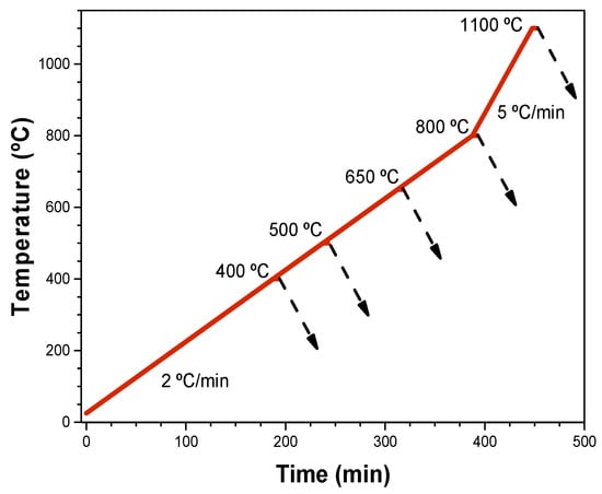 On the other hand, thermal treatments were carried out for green compacts using high-vacuum conditions (VAC) reaching up 10−5 mbar. VAC tests were done to corroborate the transformation reactions and dimensional changes observed by thermal analysis, as well as to evaluate the microstructural evolution during the decomposition stages. The VAC treatments were carried out in a high-vacuum tube furnace, model Carbolite-Hut 15/50/450 (Carbolite, Derbyshire, UK), equipped with a diffusion pump coupled to a rotary pump. The VAC treatments were performed between 400 and 1100 °C. For heat treatments from 400 °C to 800 °C, samples were heated with a heating rate of 2 °C/min. While samples treated at 1100 °C, were heated up 800 °C at 2 °C/min. Then, from 800 to 1100 °C, samples were heated at 5 °C/min. In all cases, once the chosen temperature was reached, it was maintained for 5 min, then the furnace was cooled to room temperature with a cooling rate of 5 °C/min. During dehydrogenation, a heating rate of 2 °C/min was used in order to promote the hydrogen elimination according to previous results reported by Chirico et al. [30]. Afterwards, the heating rate was increased to 5 °C/min between 800 to 1100 °C to promote sintering after dehydrogenation took place. Five specimens were analyzed for each heat treatment.