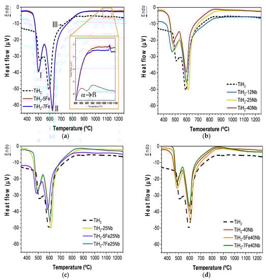 Comparison of differential thermal analysis (DTA) curves between TiH2 and mixtures of powders under high purity argon atmosphere heated at 10 °C/min. (a) TiH2-Fe (5 and 7 wt. %); (b) TiH2-Nb (12, 25, 40 wt. %); (c) TiH2-Nb-Fe (25 wt. % Nb and 5, 7 wt. % Fe) and (d) TiH2-Nb-Fe (40 wt. % Nb and 5, 7 wt. % Fe).