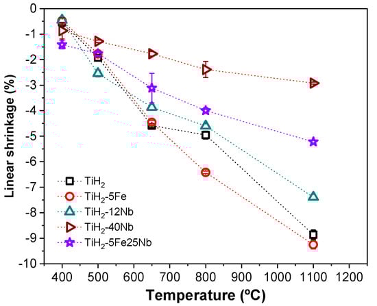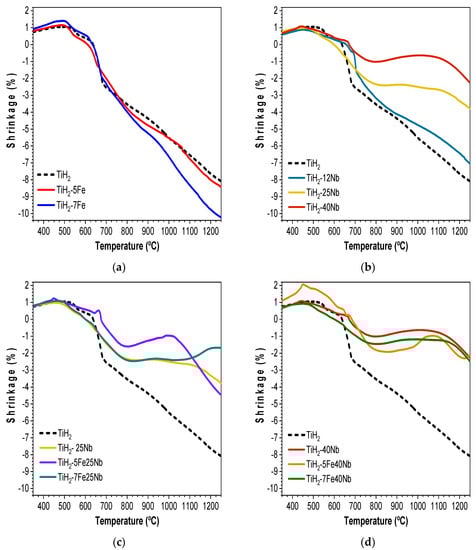 Samples with a lower amount of alloying elements (TiH2-5Fe, TiH2-7Fe, and TiH2-12Nb) presented similar shrinkage to unalloyed TiH2. As the content of alloying elements increased, shrinkage was considerably modified as compared to pure TiH2.
