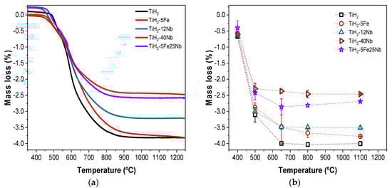Mass losses of samples tested under argon (TGA analysis) and under vacuum (VAC, heat treatment in a tubular furnace) are shown in Figure 4a,b, respectively. In both cases, the mass loss percentage is in accordance to the TiH2 fraction present in each composition. So, TiH2 exhibited the highest mass loss of 3.9%, while, as the amount of alloying elements increased, mass loss decreased. Thereby, the most alloyed composition, TiH2-40Nb, showed the lowest mass loss of 2.5%.