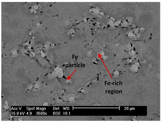 In addition, it can be seen that the Fe particles were surrounded by a brighter ring that indicated that the diffusion processes between Fe and Ti had started. This effect is shown in detail in Figure 7. Fe diffusion in α-Ti is unlikely since the maximum solubility of Fe in α-Ti is lower than in β-Ti, 0.047 and 17 wt. %, respectively. Besides, it is known that diffusivities of Fe in β-Ti is around 4 orders of magnitude larger than in α-Ti [41]. So, β-Ti might have been stabilizing around the Fe particles, even when the temperature was significantly lower than the β transus temperature expected (750 °C) according to Ti-Fe phase diagram for 5 wt. % of Fe. It is important to remark that this temperature cannot be directly compared to the phase diagrams temperature, since VAC treatments and phase diagrams were carried out under different conditions, in terms of atmosphere, time, and pressure.