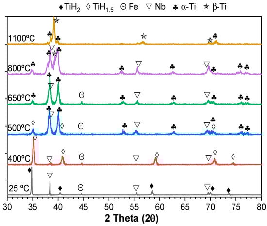 Figure 8 shows the XRD patterns of TiH2-5Fe25Nb alloy from room temperature up to 1100 °C. Similar results were found for the other compositions evaluated. At room temperature, as expected, TiH2, Fe, and Nb were identified by XRD patterns.