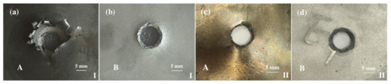 The macro-scale damage patterns of samples I and II are compared in Figure 2, where A and B denote the front surface and back surface, respectively. Sample I shows typical characteristics of a tough material, while sample II seems like a brittle material. The penetration hole diameters of two bumpers are 8.67 and 8.49 mm, and the mass losses are 1.30% and 1.24%, respectively. The Ti/Al composite layer in sample I shows a reverse petal-like failure pattern, and the Al/Mg interface is partially separated, apparently close to the crater. Sample II shows a regular circular penetration hole, and the crater of the Ti/Al layer has neat edges, with a few microcracks and tears. The back of the dumpers is also affected by shock waves, as shown in Figure 2b,d. Sample I forms bumps on the back, where cracks occurred. Due to the obvious brittleness of the Mg-matrix in sample II, it directly collapses via the shock wave. Moreover, the Al/Mg interface of sample I is completely delaminated by the lateral compression waves, while sample II is well bonded, just a slight delamination exists near the crater.