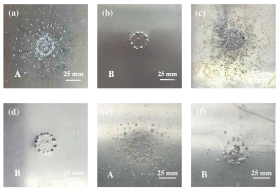 The damage of the rear wall is closely related to the assessment of protective performance. The damage characteristics of the rear wall with different dumpers are shown in Figure 3. It seems that the severely damaged regions are located at the center as a circular radial pattern. The rear wall is not penetrated in sample I, and there are many dense and overlap pits, spots and erosions on the front surface, seeing Figure 3a. The impact pits appear as blisters on the back surface without spalling. Small perforations occur which indicate failure, as shown in Figure 3c,d. The impact spots of sample II are denser than those of sample I. Perforations also produced on the rear wall, as shown in Figure 3e,f, indicating obvious failures. It can be proven that sample I and sample II have significantly better shielding performance than the aluminum alloy bumper. With the critical projectile diameter for 3.5 km/s, the shielding performance of sample I is increased by 20.4% in contrast with the aluminum bumper.