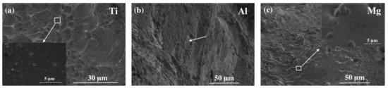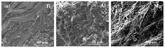 SEM micrographs of the matrix for the sample II. (a) Ti-matrix; (b) Al-matrix; (c) Mg-matrix.