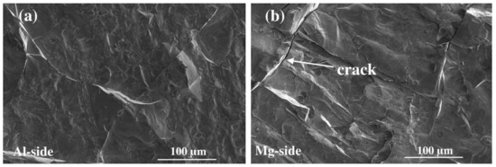 SEM micrographs of the interface for sample I. (a) Al-side; (b) Mg-side.
