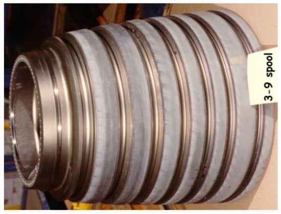 As already mentioned, the near-α alloys are not as strong at or near room temperature as either the α + β or β-alloys, but have superior creep resistance along with the improved strength retention which is important for high temperature applications such as the later stages of the high pressure compressor in an aircraft turbine engine. At the point where the gas temperature exceeds about 500 °C, the remainder of the compressor rotor is made of Ni-base alloys. In current engines it is common for all of the Ti alloy the compressor rotor stages to be a single piece as shown in Figure 6. This single piece is called a “spool” and consists of two alloys; Ti-6-4 at the front stages where the gas temperature is less than about 300 °C and Ti-6242 for the remaining Ti alloy stages. This transition is driven by the creep strength of these two alloys. The multiple stages are produced as individual forgings and are then joined either by fusion welding or by solid state inertia welding. Joining these stages into a spool eliminates bolted flanges between stages which add weight and the bolt holes also can be the source of fatigue crack initiation. An example of a 3–9 stage Ti compressor spool is shown in Figure 6 [2]. The bolted flange on the left hand end is where the remaining Ni alloy stages are connected because welding Ti alloys to Ni alloys is not possible.