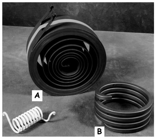 Titanium aircraft springs. Spring A is a door counterbalance clock spring fabricated from Ti-15-3-3-3 strip. Spring B is a coil spring made from square β-C wire for a launch bar power unit spring for the T-45 Trainer.