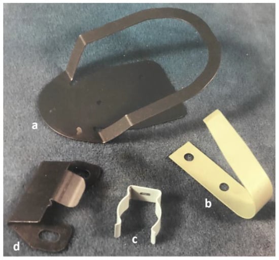 Miscellaneous components formed from Ti-15-3-3-3 sheet: (a) crew microphone holder (B-737/757); (b) access door clip; (c) tool clip); (d) interior window clip (B-747-400) [32].