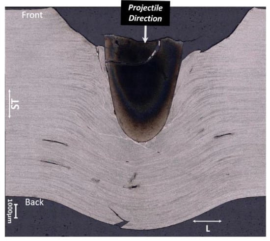 Cross-sectional view of a partial penetration of 13.6 mm (0.536 inches) Ti108 plate by a .30 AP M2 projectile at 679 m s−1 (2227 ft s−1). This impact velocity was slightly below the V50 of 687 m s−1 (2254 ft sec−1) [49].