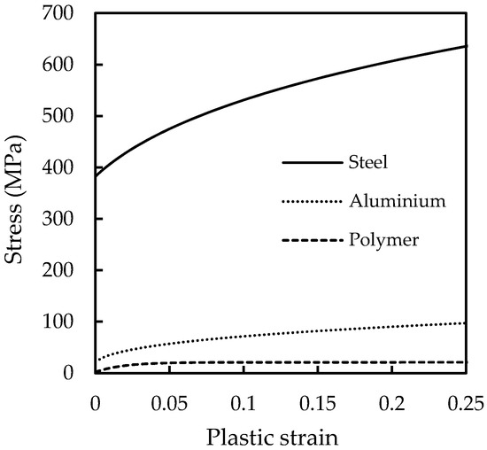 Figure 1 compares the hardening curves of the constituent materials of Composites 1 and 2, obtained from the constitutive parameters indicated in Table 1 (steel and aluminium alloy) and Table 2 (polymer). The dissimilarity in the hardening behaviour of the constituent materials of Composite 1 is much greater than in Composite 2, which allows the analysis of its influence on the mechanical behaviour of the composites.