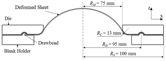 A numerical model of the circular bulge test was built in order to perform the study on the plastic behaviour of multilayer sheets. The geometry of the selected tools was based on the bulge test apparatus described by Santos et al. [17], which was also used to obtain the experimental results by Miranda et al. [8] for the steel sheet. Figure 2 schematically shows the geometry of the bulge test, where RM = 75 mm is the die radius, RC = 13 mm is the die profile radius, RD = 95 mm is the radius of the central part of the draw bead and RS = 100 mm is the initial blank radius of the circular sheet.