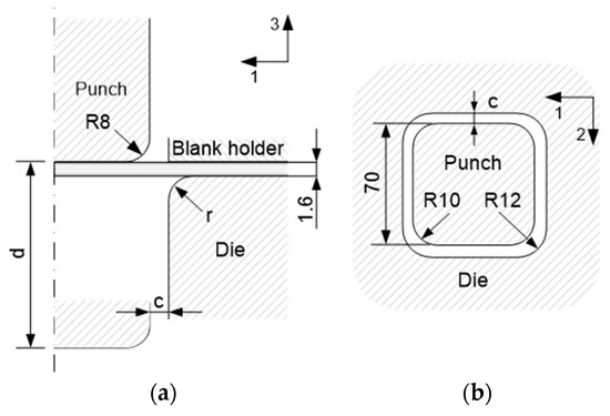 Schematic representation of the geometry of the numerical deep drawing setup for the U-channel and the square cup (dimensions in mm), data from [16,18]: (a) longitudinal sectional view of both processes, (b) top view of the square cup tooling.