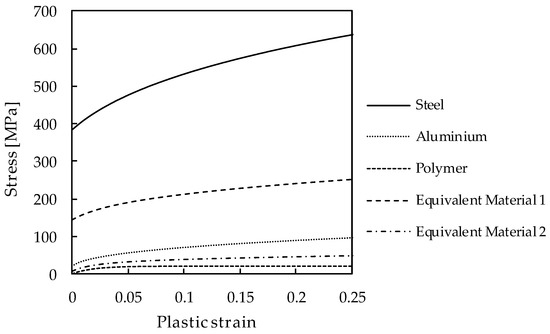 Table 4 summarizes the values of the parameters that describe the elastoplastic behaviour of both equivalent materials, where materials “Equivalent 1” and “Equivalent 2” refer to single sheet materials estimated as equivalent to “Composite 1” and “Composite 2”, respectively. Figure 4 illustrates the comparison of the hardening curves of the equivalent materials with those of the metallic outer layers and polymer inner layer of each composite (see Figure 1).