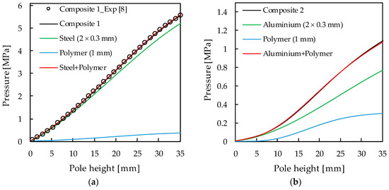 Numerical simulations of the circular bulge test were performed with both composite materials, each with a total thickness of 1.6 mm. The numerical simulations were also performed for each of the constituent materials of Composite 1 and Composite 2: (i) steel (with a total thickness of 2 × 0.3 mm = 0.6 mm); (ii) aluminium (2 × 0.3 mm = 0.6 mm thickness); (iii) polymeric core (1 mm thickness). Figure 5 presents the pressure vs. pole height results for Composite 1 and Composite 2 as well as for their constituent materials (“Steel (2 mm × 0.3 mm)”, “Aluminium (2 mm × 0.3 mm)” and “Polymer (1 mm)”, in the figure); the experimental pressure vs. pole height results of Composite 1 (“Composite 1_Exp [8]” in Figure 5a), obtained by Miranda et al. [8], are also included. Finally, the results of pressure vs. pole height of the composite materials are presented as the sum of the results of their independent components: outer metallic layer + polymeric core results (see curves “Steel + Polymer” and “Aluminium + Polymer”, in Figure 5). No differences are observed between these curves and those of the composites.