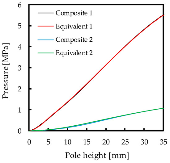 Pressure vs. pole height evolutions for the two composites and the respective equivalent materials, confirming the overlapping.