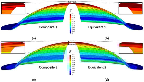 Figure 7 presents the distributions of the equivalent plastic strain in the sheet, at the end of the bulge test (pole height equal to 35 mm), for composites 1 and 2 (Figure 7a,c, respectively)) and their corresponding equivalent materials (Figure 7b,d). The maximum values of equivalent plastic strain, at the pole of the cup, are very similar in all cases, and about 30%, although the strain values in the inner layer of the composites are slightly lower than in the corresponding equivalent materials.
