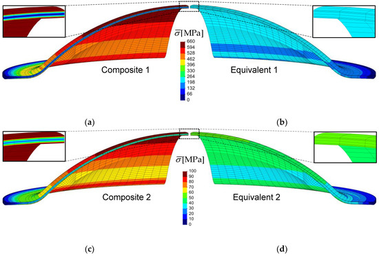 Distribution of equivalent stress at the end of the bulge test for the: (a) Composite 1; (b) Equivalent material 1; (c) Composite 2; (d) Equivalent material 2.