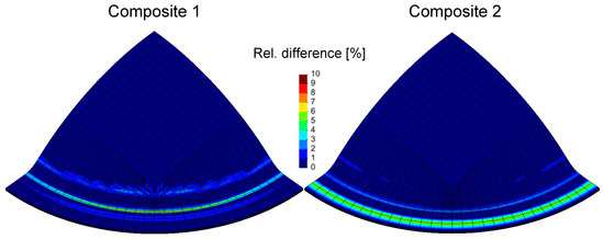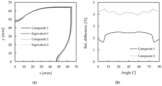 Figure 9 shows the distributions of relative difference between the equivalent stress obtained for the numerical simulation of the equivalent material and the equivalent stress calculated from the mixture rule approach (Equation (3)), using the numerical results of the composite. In general, the equivalent stress distributions, obtained for the equivalent materials, obey to the rule of mixtures, which is not limited to the pole of the cup.