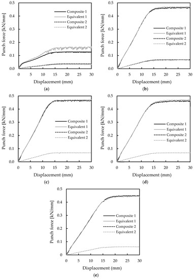 Evolution of the punch force, normalized with the blank width, vs. its displacement during the deep drawing process of the U-channel for the composites 1 and 2, and their corresponding equivalent materials: (a) case A; (b) case B; (c) case C; (d) case D; (e) case E.