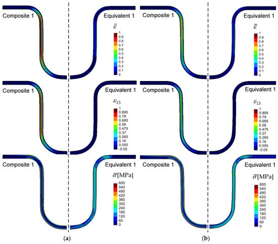 Distributions of equivalent plastic strain, , Green–Lagrange shear strain, , and equivalent stress, , for Composite 1 and the equivalent material: (a) Case A; (b) Case B. The maximum values of , and are, respectively: 0.976, 0.978 and 515.75 MPa (for Composite 1 in Case A); 0.717, 0.619 and 578.23 MPa (for Composite 1 in Case B); 0.340, 0.007 and 267.71 MPa (for Equivalent 1 in Case A); 0.327, 0.007 and 263.5 MPa (for Equivalent 1 in Case B).