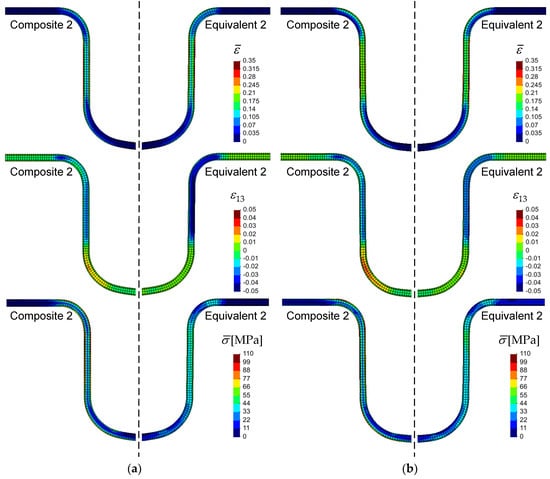 Distributions of equivalent plastic strain, , Green–Lagrange shear strain, , and equivalent stress, , for Composite 2 and the equivalent material: (a) Case A; (b) Case B. The maximum values of , and are, respectively: 0.302, 0.02 and 103.86 MPa (for Composite 2 in Case A); 0.318, 0.032 and 105.52 MPa (for Composite 2 in Case B); 0.341, 0.01 and 53.86 MPa (for Equivalent 2 in Case A); 0.337, 0.01 and 53.53 MPa (for Equivalent 2 in Case B).