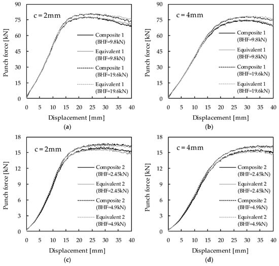 Force vs. displacement of the punch during the square cup forming process, for two values of clearance, c: (a) and (b) Composite 1 and equivalent material 1, for c = 2 mm and 4 mm, respectively; (c) and (d) Composite 2 and equivalent material 2, for c = 4 mm, respectively.