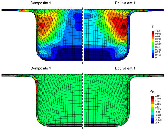 Side view of the equivalent plastic strain distributions, , and Green–Lagrange shear strain, , in the Composite 1 and corresponding equivalent material, at the end of the deep drawing process for BHF = 19.6 kN. The maximum values of . and are, respectively: 0.989 and 0.817 (for Composite 1); 1.038 and 0.073 (for Equivalent 1).
